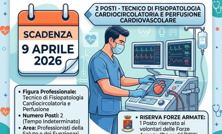 - Figura ricercata: Tecnico di fisiopatologia cardiocircolatoria e perfusione cardiovascolare (Area dei professionisti della salute e dei funzionari – ruolo sanitario).